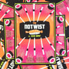 A double split-fountain of fishy bright pink and orange, some Wasabi-green and the key-colour again is a very dark navy blue with black and silver that causes some fancy glimmer.
